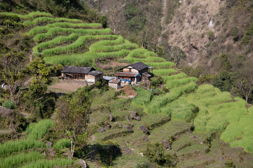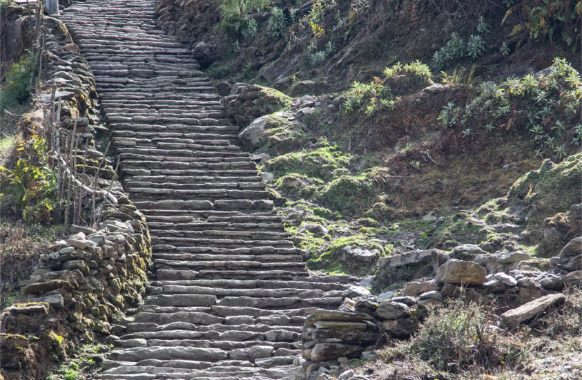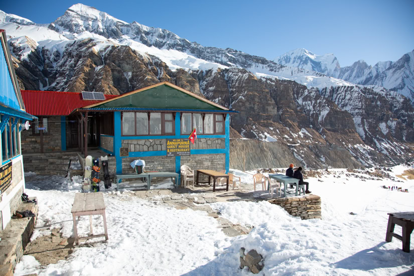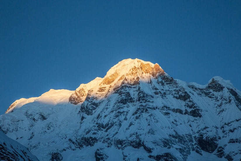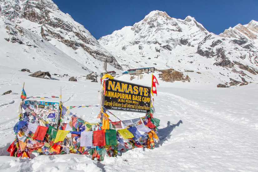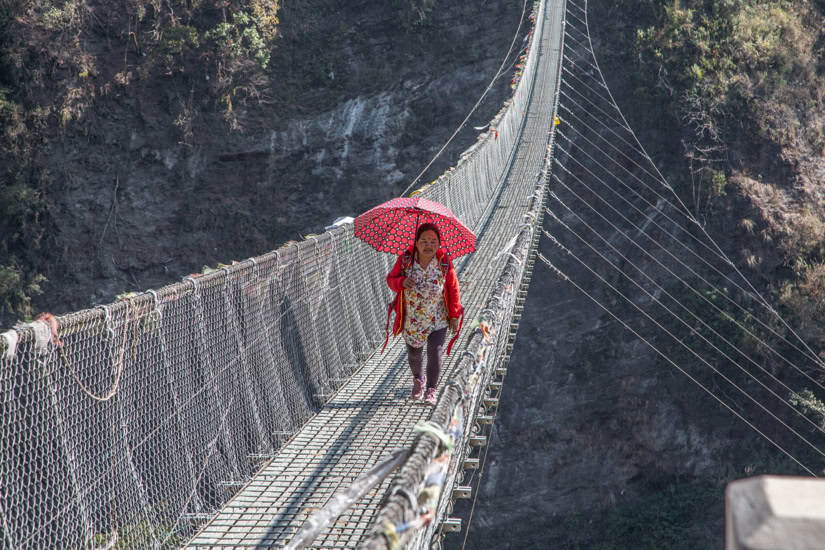 Auf dem Weg ins Annapurna Base Camp in Nepal. Die 2.170 Meter lange Hängebrücke über den Modi Khola führt nach Chomrong. Tausende von Steinstufen müssen von Phedi (1.160m) bis ins Base Camp (4.130m) bewältigt werden. Annapurna Base Camp (4.130 Meter) mit Annapurna I (8.091 Meter)